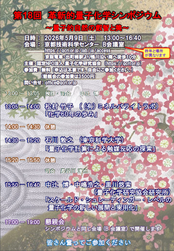量子化学研究協会(QCRI)では、恒例の「革新的量子化学シンポジウム・第18回」を、2026年5月9日(土)、京都技術科学センター B会議室にて開催いたします(昨年と場所が異なり、私達の研究所のある所です)。